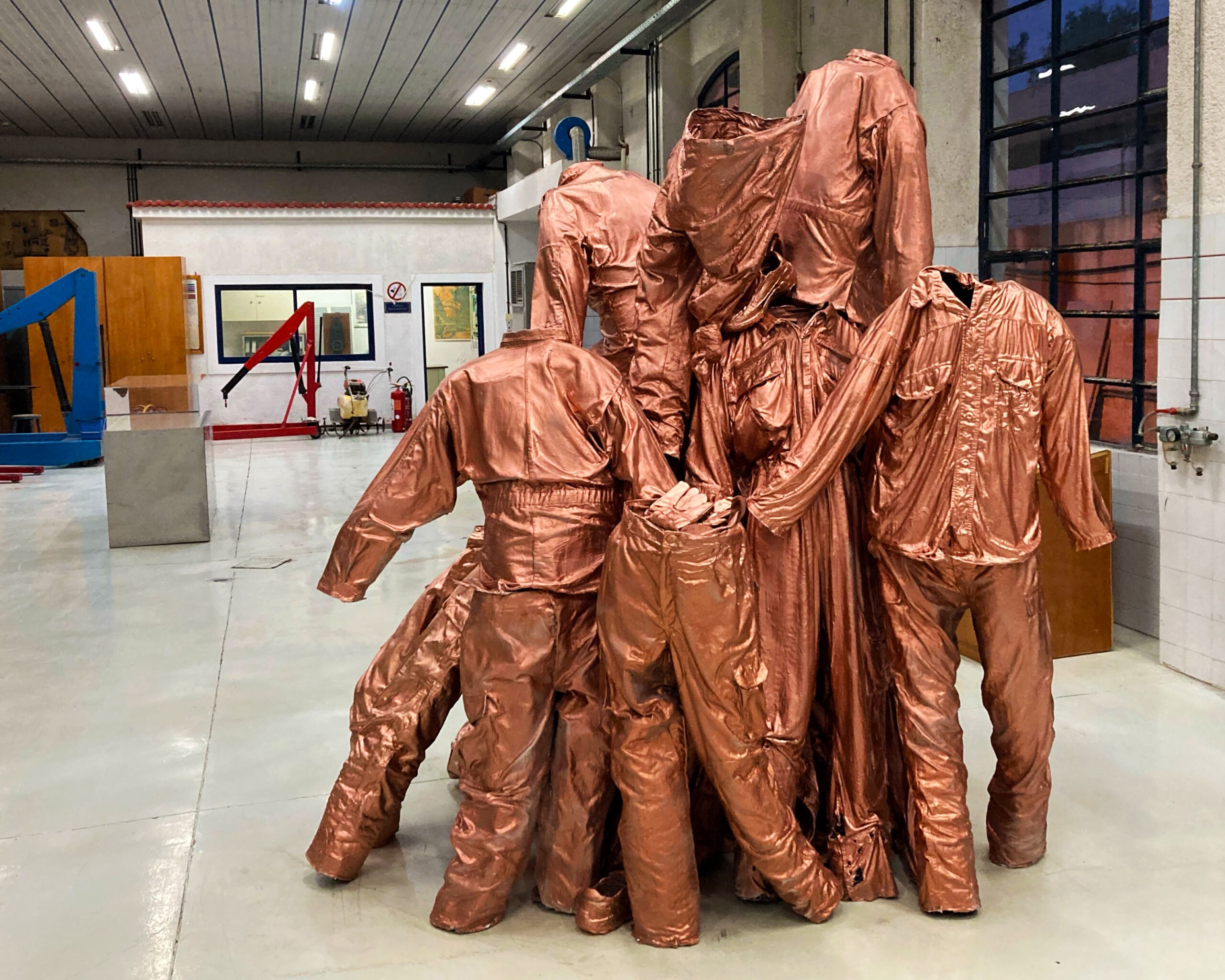 a utilitarian, quotidian item in the reality of the power station to a timeless presence. Vaxevanidi treats monumentality in a manner that brings fragility to the forefront. She engages in a playful critique of dominant practices and representations, harnessing the potential for plasticity of the fabrics and translating metal textures into more fragile materials, such as plaster.