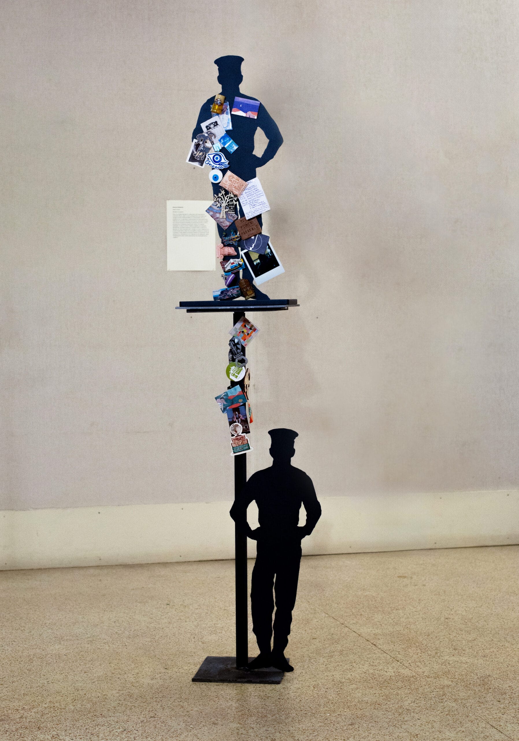 The metal figure of the Tsarouchian sailor is adorned with tourist souvenir magnets, small, inexpensive representations and symbols from places that have been laminated for the consumption of their visitors. These small magnetic souvenirs are an encoded and simplified means of transmitting a place’s tourist identity and act as a commentary on how identity is pasted on and commercialized. The sailor is transformed into a souvenir image substrate, into a tourist outline. His body becomes a reflective surface for a common fantasy, an experience packaged as a commercial product. Pairing the sailor figure, borrowed from the world of Giannis Tsarouchis, with tourist magnet souvenirs creates a contrast between poetry and commerce. The artwork refers to the distance between Tsarouchis’ personal, lyrical conception of “Greekness” and its everyday mass reproduction through easily recognisable, repetitive symbols.