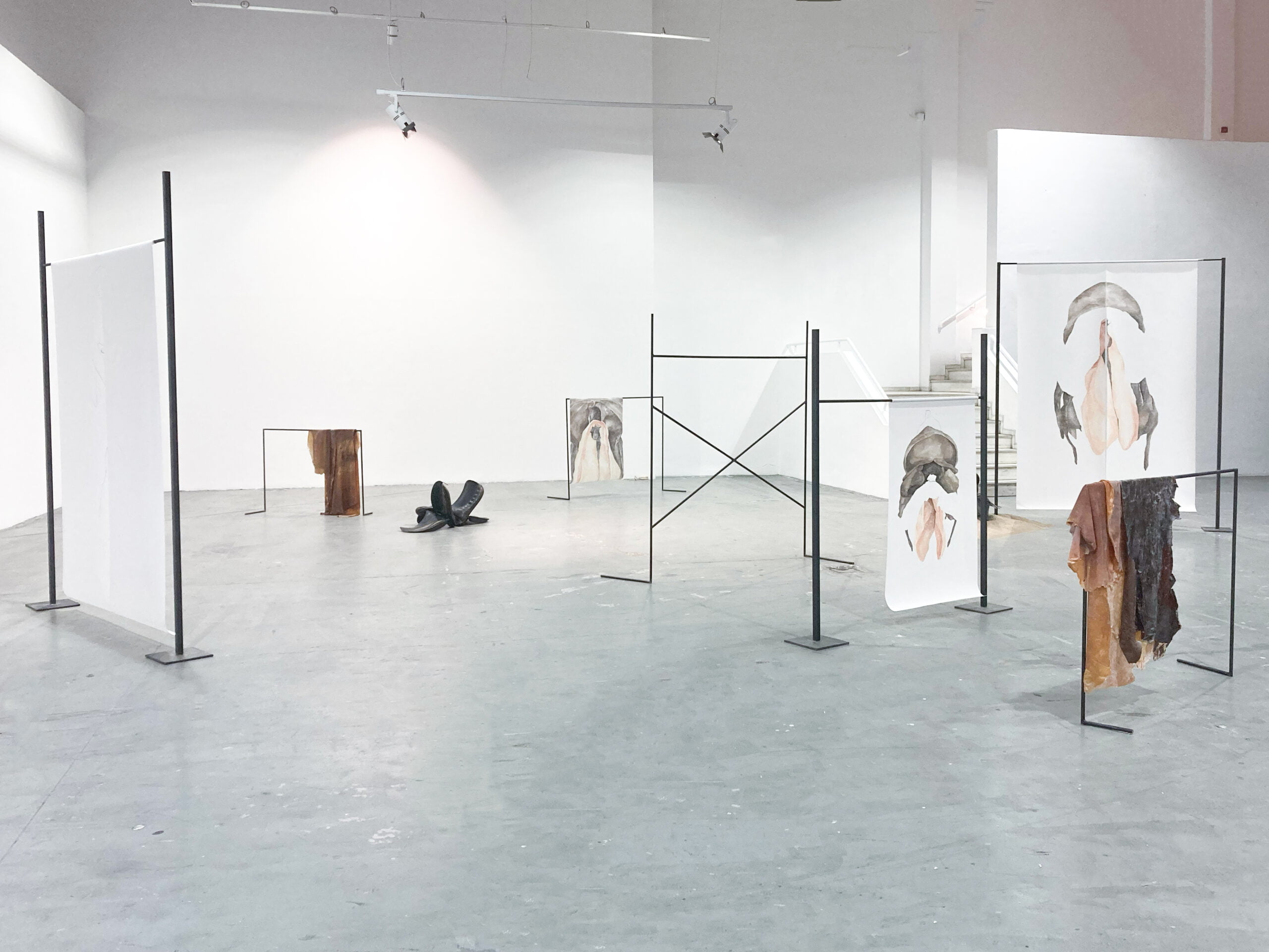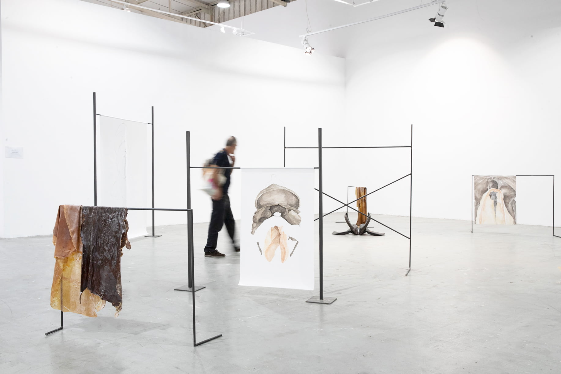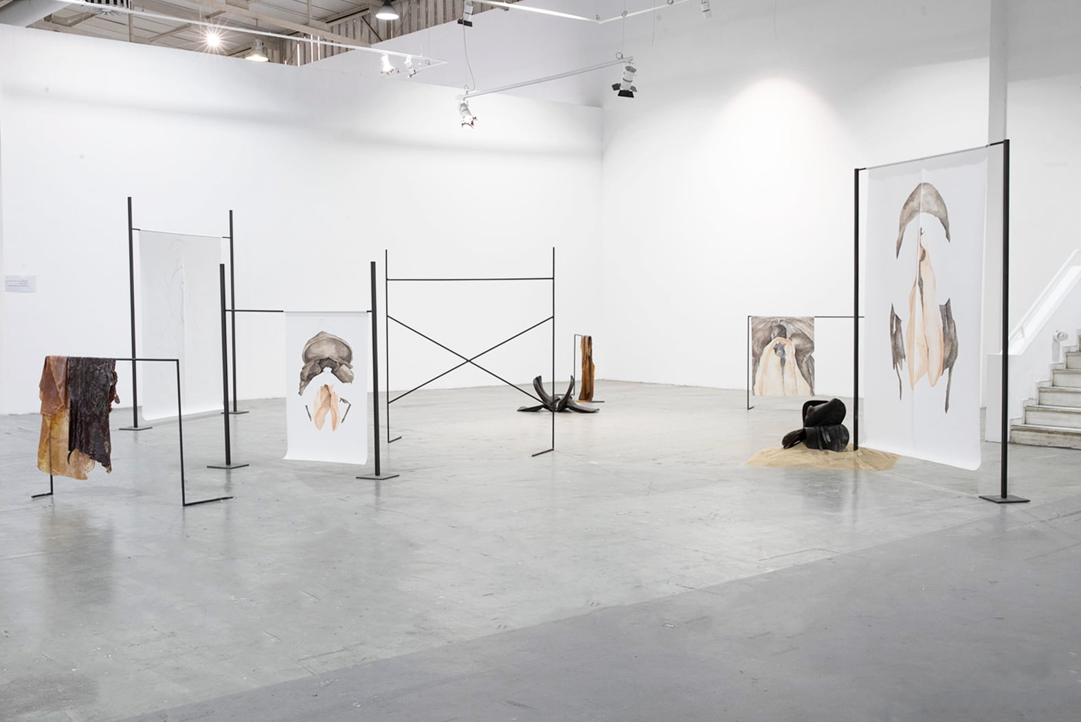 The drawings are placed on metal frames in a configuration that evokes the obstacles of horse riding.