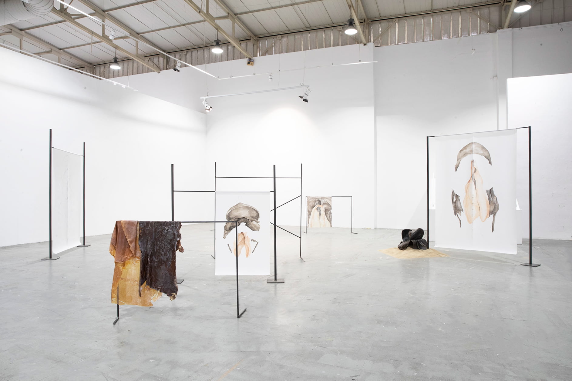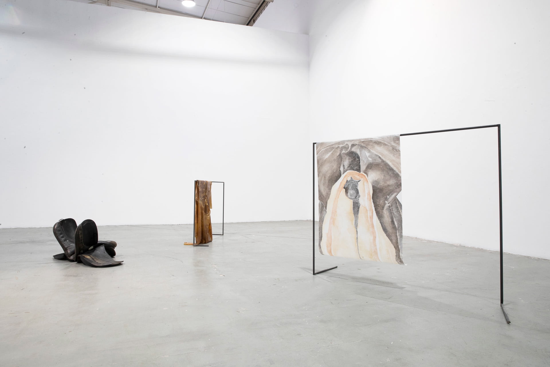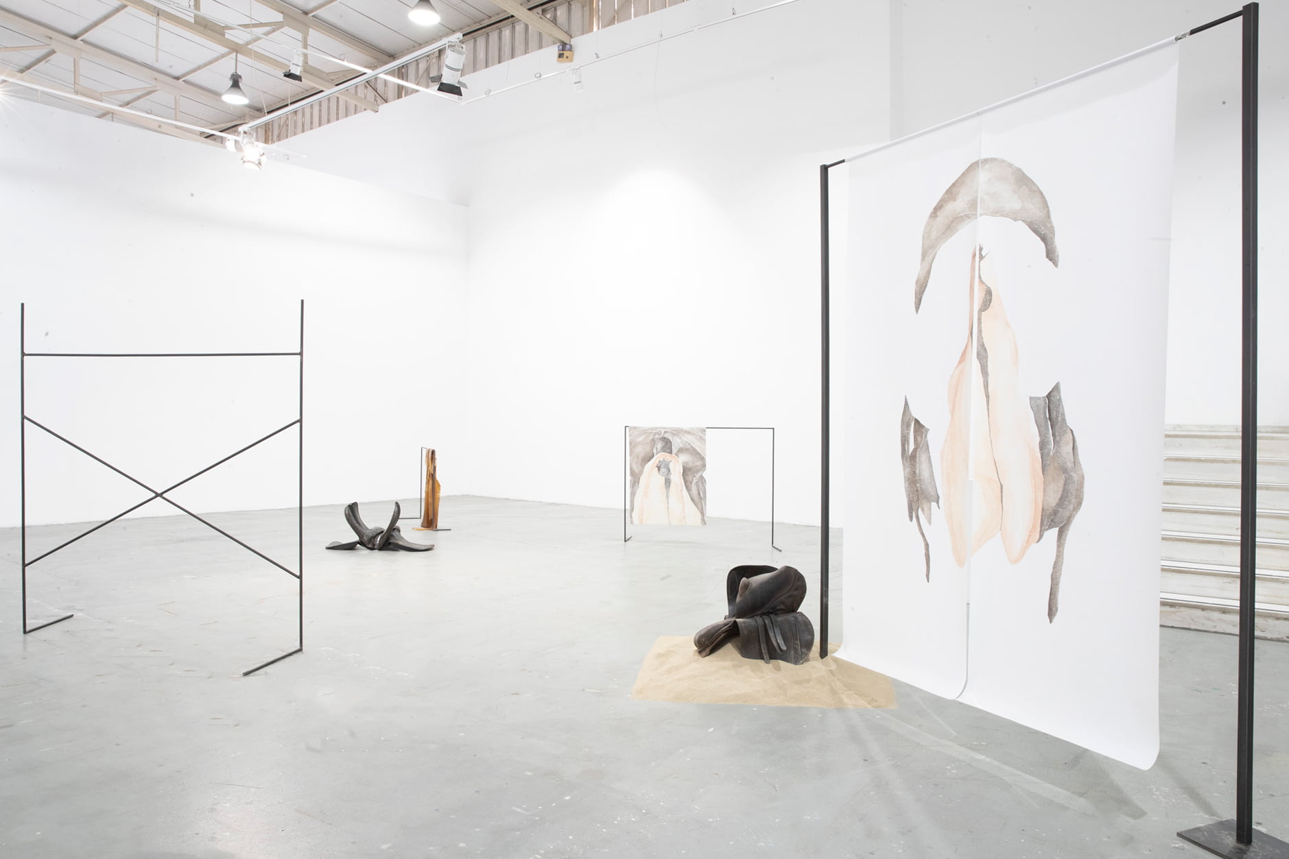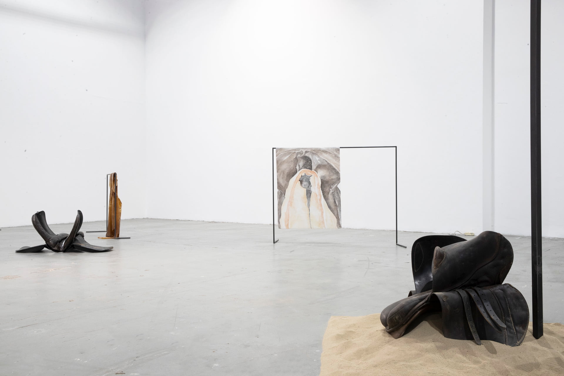 The installation consists of paintings, iron scaffolding, layers of latex, saddles and sand. It concerns a search for concepts, form and materiality deriving from the saddle (oáyua).